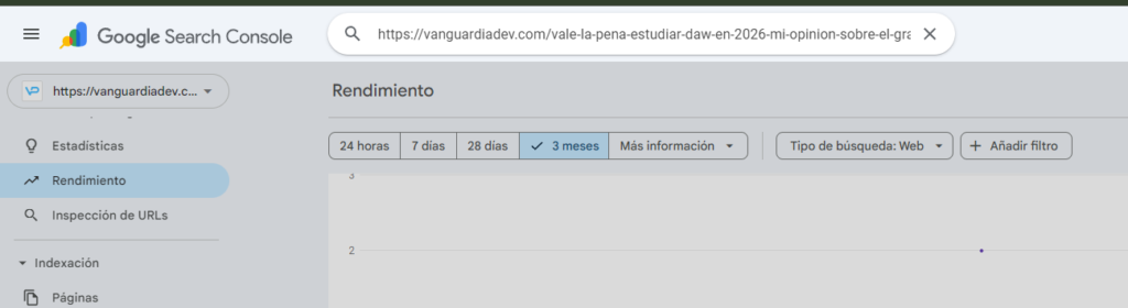 Si acabas de publicar un artículo (como el de «Vale la pena estudiar DAW»), no esperes a que Google lo encuentre solo. Pega la URL en la barra superior de Search Console (Inspección de URLs) y dale a «Solicitar indexación». Esto acelera el proceso para que aparezcas en los resultados en cuestión de horas o pocos días.